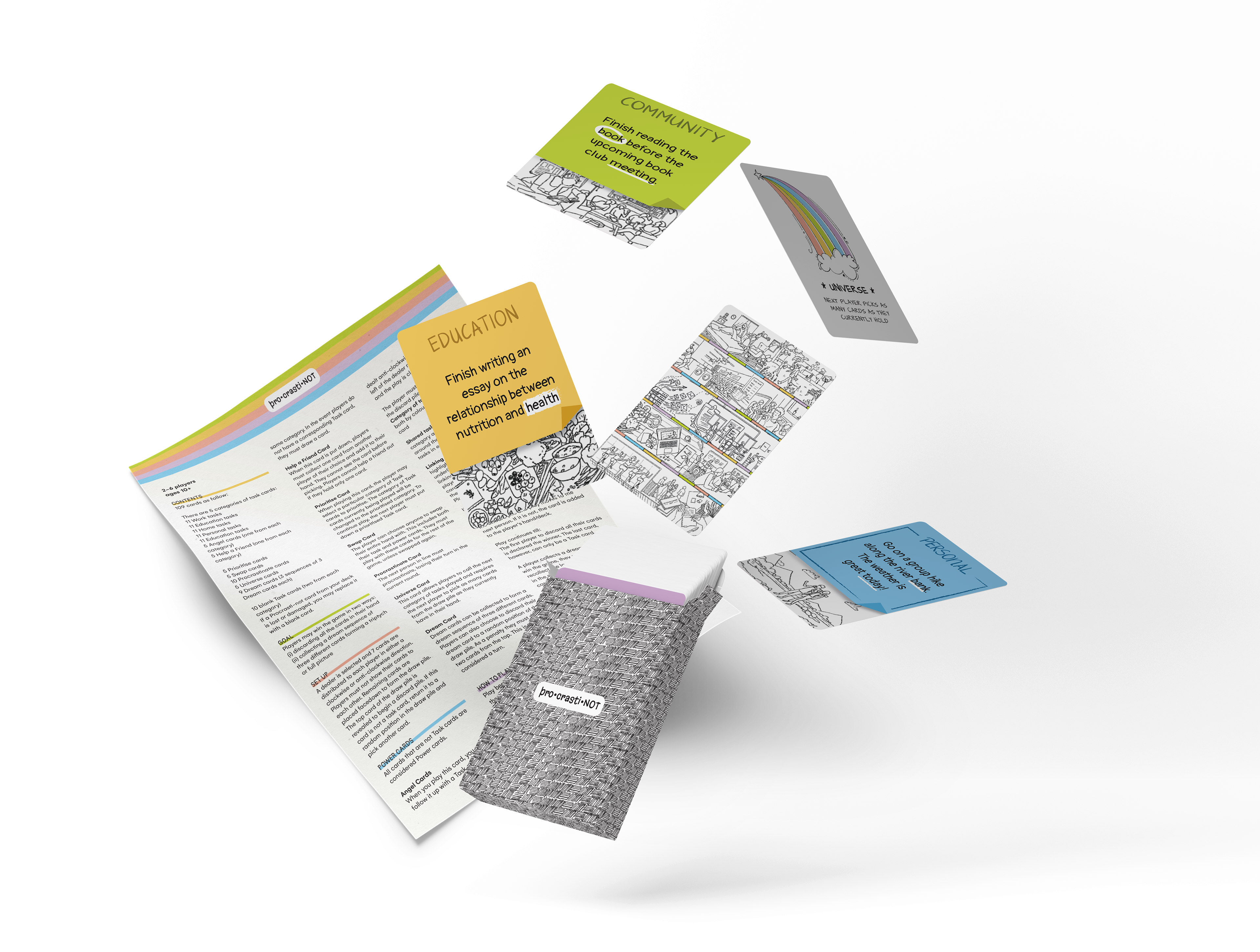 pro-crasti-NOT is a multiplayer strategy card game that abstracts completing everyday tasks on people's to-do lists as a metaphor to how people navigate life by juggling many things.